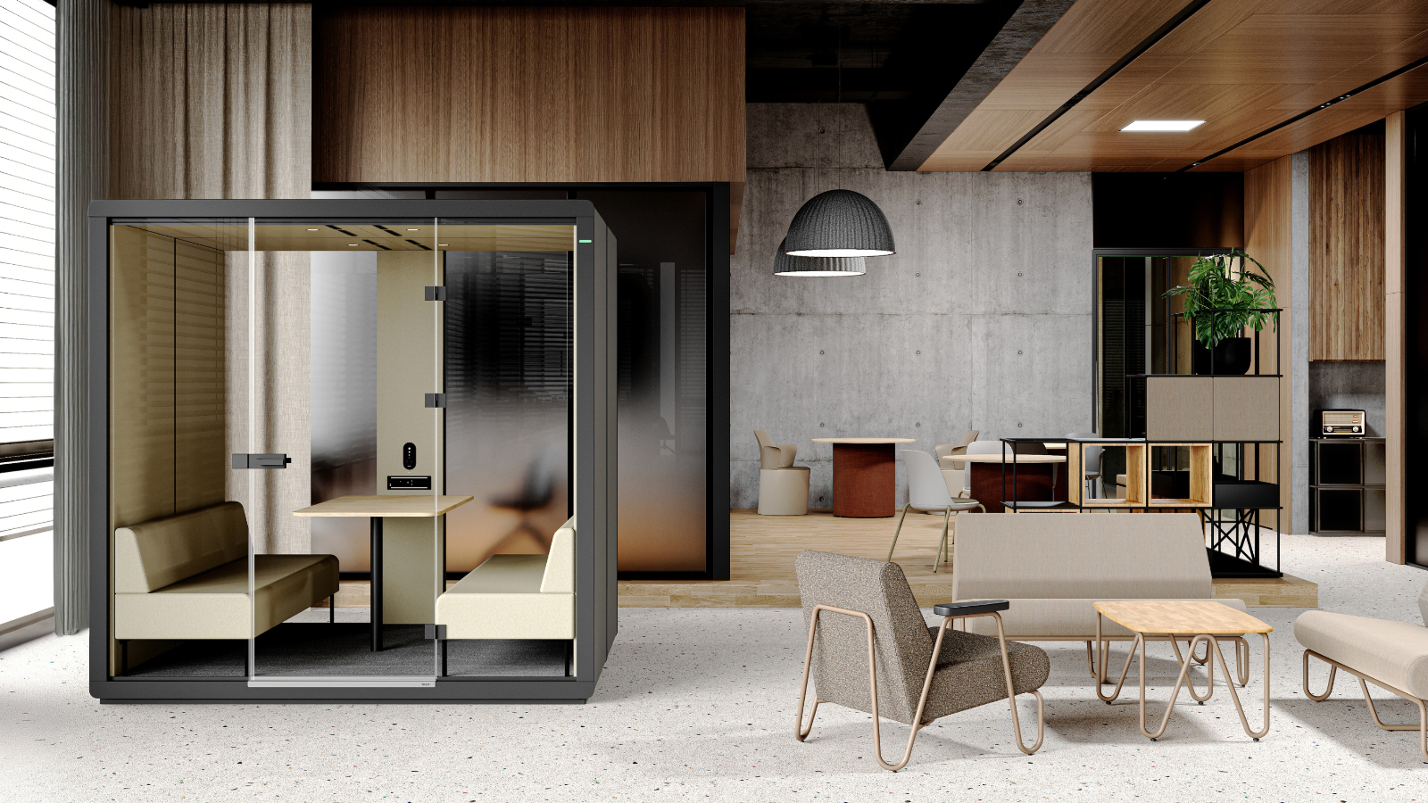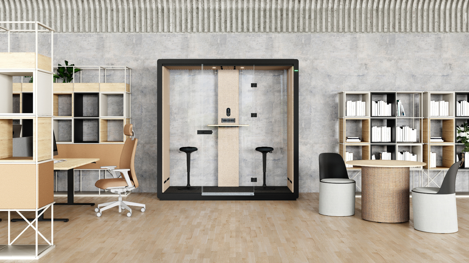 - six-person booth for team meetings, brainstorming sessions, and project work